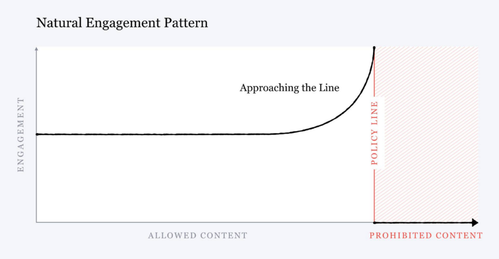 En 2018, Mark Zuckerberg presentó una gráfica6 muy reveladora que mostraba cómo las personas interactúan de forma desproporcionada con contenido sensacionalista y provocador. Su intención era revertir esta tendencia reduciendo la visibilidad de dicho contenido.